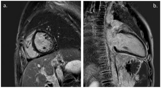Cardiac Magnetic Resonance: (a). PSIR, short axis. Mild LGE with subepicardial pattern involving LV infero-lateral wall. (b). PSIR, LV 2-chamber. Mild intramyocardial LGE of the mid-basal inferior wall; also note, persistence of mild pericardial LGE.