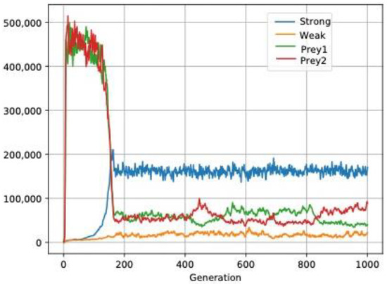 - Falgueras-Cano, J.; Falgueras-Cano, J.A.; Moya, A. A study of the coevolution of digital organisms with an evolutionary cellular automaton. Biology 2021, 10, 1147. [Google Scholar] [CrossRef]