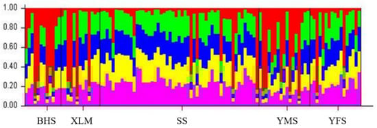Genetic structure based on microsatellite genotypes in leopard cat subpopulations in the five sampling areas (k = 5). BHS represents Baihuashan in red, XLM represents Xiaolongmen in yellow, SS represents Songshan in green, YMS represents Yunmengshan in magenta, and YFS represents Yunfengshan in blue.