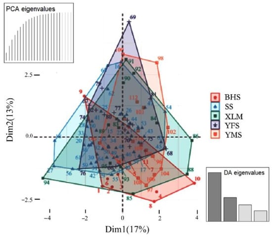 The results of the DAPC analysis showed that there was no significant genetic differentiation among the five subpopulations (Figure 3). However, if individual 9 was excluded (dot 9 in the upper left of the plot), most of the individuals in the BHS group were clustered in the lower right, which may indicate that this subpopulation intended to separate from other groups.