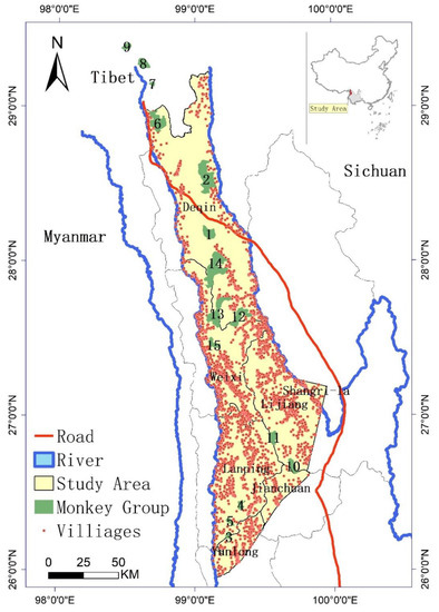 The continuing development of villages around the monkey habitat, as well as other factors, have led to overlap between the villages and the monkey habitats [7,8]. Human activities in these overlapping villages, such as deforestation and land cultivation for agriculture to develop their economies, have impacted the monkey habitat. Increase in the monkey population is limited by the loss, degradation, and fragmentation of its habitat, and risk of decline in the monkey population is increased [3,4,5].