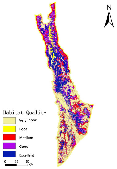 Spatial distribution pattern of habitat quality in 2018.