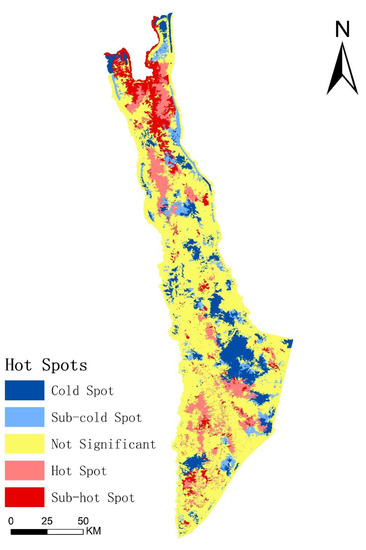 Hot spot analysis map of habitat quality in 2018.