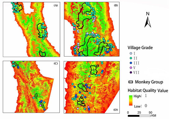 Habitat quality, habitat patch size, and habitat connectivity mutually trade off against each other [43]. The habitat quality of the C3, C6, and C14 monkey groups is relatively low due to the development on villages. This indicates that village development had a strong influence on habitat quality, with the higher development level of a village translating to a lower habitat quality of the monkey group. We should enhance habitat connectivity and build up ecological corridors to promote gene exchange and conserve genetic diversity in these areas where connectivity with other monkey groups is impeded by agriculture and grazing land, roads, and villages. This is especially true for the isolated monkey groups (C3, C6, and C14) [4,5,6,44].