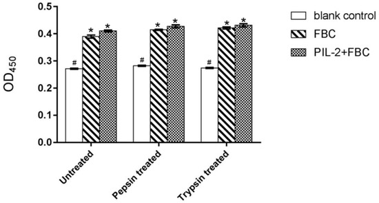 Compared to intramuscular injection, oral inoculation is generally considered to be the feasible treatment with several advantages, including lack of invasiveness, safety, simplicity, and lower costs. However, oral inoculation frequently resulted in poor efficacy due to the harsh environment of the gastrointestinal tract [34]. In order to avoid enzymatic digestion in the gut and to improve the expression in vivo, IL2 and FBC were expressed in Pichia pastoris, which is an effective encapsulating vehicle and a safe, commonly used vector for the expression of heterologous genes for oral use [15,35,36]. The results of simulating enzyme digestion in the digestive tract showed that the lymphocyte proliferation activity of IL-2 and the antimicrobial efficacy of FBC were not severely affected by pepsin and trypsin in vitro. The fused PIL-2/FBC-treated mice did not show any obvious lesion or systemic symptom after challenge with virulent drug-resistant E. coli and S. aureus. Taken together, these also confirmed that Pichia pastoris is an effective and safe delivery for co-expressed IL-2 and FBC immunopotentiator.
