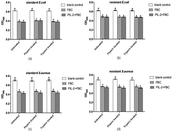 Antimicrobial activities of different recombinant Pichia pastoris supernatants in vitro. The bioactivity of the PIL-2/FBC co-expression protein was measured by inhibition of 4 pathogen strains, including standard E. coli ATCC25922 (a), S. aureus ATCC26112 (c); multi-antibiotic-resistant strains E. coli (b) and S. aureus (d). Untreated: the original recombinant yeast ferment supernatant; Pepsin treated: the recombinant yeast ferment supernatant digested with pepsin. Trypsin treated: the recombinant yeast ferment supernatant digested with trypsin. Blank control: pGAPZαA group. FBC: pGAPZαA-FBC group. PIL-2/FBC: pGAPZαA--PIL2/FBC. (*) p < 0.05 vs. blank control. (#) p < 0.05 vs. FBC. N = 3 (mean ± SD).