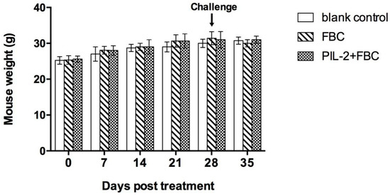 Compared with the blank control group, the body weights of the PIL-2/FBC group and the FBC group mice were not significantly different over the entire observation period (p > 0.05) (Figure 3).