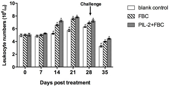 Compared with the blank control group, the leukocytes of the PIL-2/FBC group and the FBC group increased significantly from 14 to 35 days post-treatment (p < 0.05), and the difference between these two groups was not significant from 7 to 35 days (p > 0.05) (Figure 4).