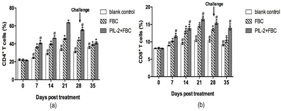 Changes of CD4+ (a) and CD8+ T (b) cells in the peripheral blood of mice. The amounts of CD4+ and CD8+ T cells significantly increased in the blood of treated groups PIL-2+FBC and FBC from 7 to 35 days compared with the control group (p < 0.05), moreover, the amounts of CD4+ and CD8+ T cells in PL-2+FBC group were higher than FBC from 7 to 35 days (P<0.05). Blank control: pGAPZαA group. FBC: pGAPZαA-FBC group. PIL-2/FBC: pGAPZαA--PIL2/FBC. (*) p < 0.05 vs. blank control. (#) p < 0.05 vs. FBC. N = 10 (mean ± SD).