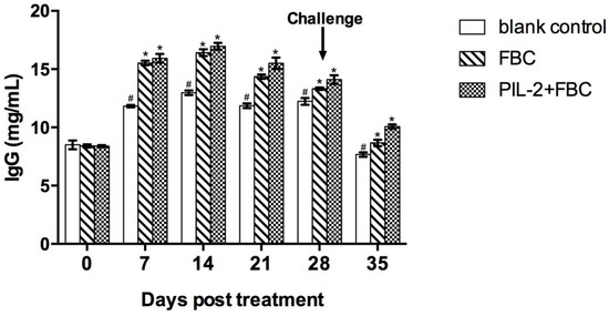 Compared with the blank control group, IgG significantly increased in the sera of the experimental group and the FBC control group from 7 days thereafter (p < 0.05), but the difference in IgG was not significant between the two treated groups (p > 0.05) (Figure 6).