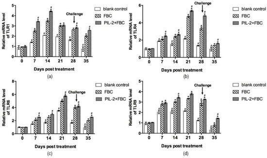 Figure 7 shows that the fused PIL-2/FBC group manifested the highest increases in TLR-1, TLR-4, TLR-6, and TLR-9 mRNA expression compared to the two control groups (p < 0.05), and after the challenge, the mRNA expressions of TLRs in the PIL-2/FBC group were also significantly higher than the FBC and blank control mice (p < 0.05).