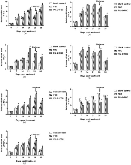 Expression of mRNA levels of IL-2 (a), IL-4 (b), IL-6 (c), IL-12 (d), IFN-γ (e), IL-10 (f), and TNF-α (g) genes in the blood of the experimental mice. All the gene expression levels of treated groups were significantly increased compared with the control group except IL-10 (p < 0.05), and the IL-4, IFN-γ and TNF-α of PIL-2/FBC group elevated significantly compared to FBC group from 28 to 35 days or 21 to 35 days, respectively, (p < 0.05); While IL-10 of PIL-2/FBC group remarkably decreased compared with the control group and FBC group during the whole experiment period (p < 0.05). Blank control: pGAPZαA group. FBC: pGAPZαA-FBC group. PIL-2/FBC: pGAPZαA--PIL2/FBC. (*) p < 0.05 vs. blank control. (#) p < 0.05 vs. FBC. N = 10 (mean ± SD).