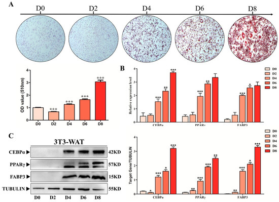 The preAD cells were cultured in adipogenic medium for up to 8 days (D8), and Oil Red O (ORO) staining was performed to detect the adipogenic differentiation of preAD cells. As shown in our results, ORO staining significantly increased (p < 0.001) gradually from D0 to D8 while similar results were obtained with the quantification of ORO staining (Figure 4A). Moreover, the mRNA and protein expression of key adipogenic markers, including PPARγ and CEBPα were upregulated during adipogenic differentiation within D8 (Figure 4B,C). Consistent with PPARγ and CEBPα, FABP3 expression was also significantly increased during preAD cell differentiation from D0 to D8. All these results indicate that FABP3 might play a key role in the preAD differentiation process similar to the adipogenic markers, PPARγ and CEBPα.