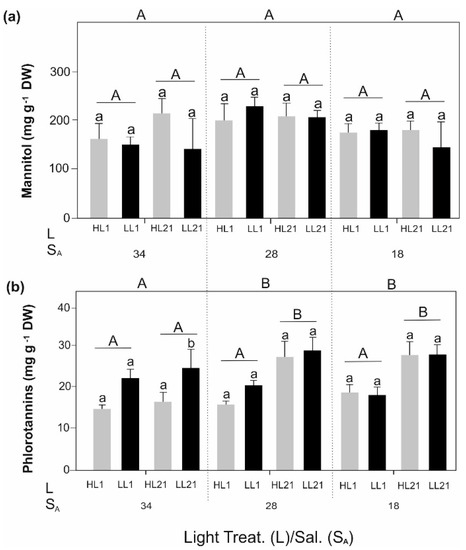 Concentration in mg g−1 dry weight (DW) for compounds in Desmarestia aculeata: (a) Mannitol; (b) Phlorotannins. Experimental set-up: salinity (SA)–Light (L) (High Light (HL)–Low Light (LL)) treatments. Values are means ± SD (n = 3). Statistically significant differences between HL and LL per treatments are marked by different lowercase letters. Statistically significant differences between treatment days (1–21) are marked by different uppercase letters and differences between salinities (SA 34, 28, and 18) are marked by different uppercase letters outside the graph. For all the data, three-way ANOVA with post-hoc Tukey’s test was performed (p < 0.05).