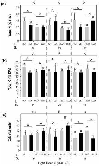 Elemental composition of Desmarestia aculeata at days 1 and 21 of treatment. (a) Contents of total N (% DW); (b) Contents of total C (% DW); (c) C:N ratio. Experimental set–up: salinity (SA)—Light (L) (High Light (HL)–Low Light (LL)) treatments. Values are means ± SD (n = 3). Statistically significant differences between HL and LL per treatments are marked by different lowercase letters. Statistically significant differences between treatment days (1–21) are marked by different uppercase letters and differences between salinities (SA 34, 28, and 18) are marked by different uppercase letters outside the graph. For all the data, three-way ANOVA with post-hoc Tukey’s test was performed (p < 0.05).
