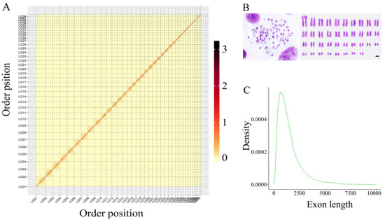 The Hi-C heatmap, karyotypes, and exon length of the male O. bidens. (A) A Heat map generated by Hi-C technology presented contact matrices of thirty-eight chromosomes. The color bar indicates the logarithm of the strength of the contact density. (B) The karyotypes of male O. bidens’ genome. (C) The distributions of gene exon length in male O. bidens’ genome.