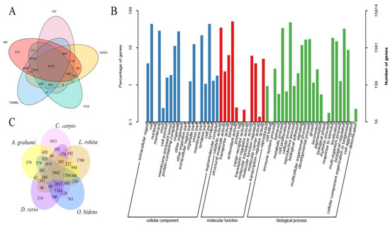 Gene annotation and function of male O. bidens’ genome. (A) Different database-annotated genes. (B) Gene functionally classification by GO analysis. (C) A Venn diagram showing the number of species-specific and shared gene orthogroups of O. bidens between D. rerio, L. rohita, C. carpio, and A. graham.