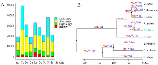 In total, 4350 single-copy orthologs and 18,271 gene families were identified in the assembled genome of male O. bidens by clustering homologous genes in S. rhinocerous, A. grahami, L. rohita, D. rerio, O. latipes, T. rubripes, C. carpio, and G. aculeatus (Figure 3A). A phylogenetic tree was constructed using these single-copy orthologues (Figure 3B). Together with calibration times, the results showed that O. bidens was divided from D. rerio at approximately 89.69 Mya, separated from L. rohita at about 57.77 Mya, then isolated from A. grahami at approximately 29.74 Mya, indicating a rapid differentiation among these species.