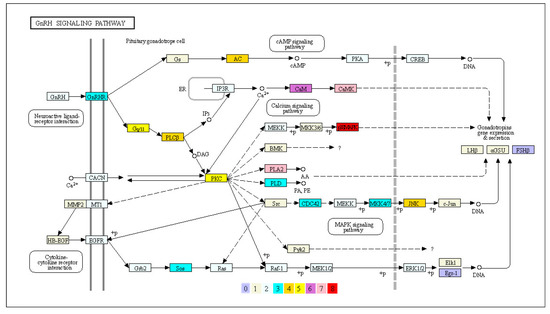 GnRH is secreted from the hypothalamus and plays a key role in the control of vertebrate reproductive functions by binding to its specific membrane receptor, GnRHR, triggering the synthesis and release of pituitary gonadotropins, including follicle-stimulating hormone, LH, and CG, to induce gonads that produce sex steroids for gametogenesis [64,65]. In the hypothalamus–pituitary–gonadal axis, the GnRH signaling cascade control process is essential for maintaining gonadotropin synthesis and release. It plays an important role in developing secondary sex characteristics [66].