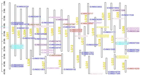 To uncover the mechanism of gene expansion, we examined the distribution of the expanded genes in the chromosomes of male O. bidens. The 78 expanded genes were dispersed in 29 chromosomes (Figure 5), accounting for 76.32% (29/38) of the whole chromosomes of male O. bidens. The top three chromosomes with expanded gene numbers were LG01 (seven genes), LG06 (six genes), and LG08 (five genes). A few expanded genes were clustered in one chromosome; for example, protein kinase C (PKC: PRKCB) with three genes was clustered in LG01 (EVM0000057, EVM0001656, EVM0005614), whereas part of PKC (PRKCB) was coupled in LG24 (EVM0001136, EVM0024807). This is true for PLA2 (EVM0020264 and EVM0034744) in LG06, and EVM0001701 and EVM0026993 in LG07, indicating that a piece of chromosome breaks off, resulting in gene expansions [22].