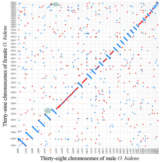 Genomic comparisons between female and male O. bidens. Genomic comparisons of whole genome sequences directly, and the majority of female and male O. bidens chromosomes exhibited 1:1 correspondence except for chromosomes LG06 in male and GH14 and GH38 in female.