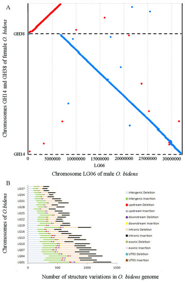 To verify the hypothesis of chromosome breakage and reunion, comparative chromosome analysis was performed using MUMmer4 to identify genome-scale syntenic regions between female and male O. bidens. The genome sequences corresponding to their chromosomes were highly consistent (Figure 6). Similarly, the chromosomal sequences of female GH14/GH38 exhibited a significant identity with the male LG06 using MUMmer4 with a minimum match length of 1000 bp and 85% of filter (Figure 7A). The female GH14/GH38 chromosomal sequence alignment to the male LG06 showed identities of 97.93% and 97.72%, respectively, suggesting that the female GH14 and GH38 fused to form the male LG06. Indeed, structural variations were identified by performing sequence comparisons, and we found that, in the male LG06, the deletions included 232 in the intergenic region, 20 in the upstream region, 12 in the downstream area, and 259 in the intronic region. The insertion sites included 218 in the intergenic region, 26 in the upstream region, 23 in the downstream region, and 248 in the intronic area. Finally, the duplication, inversion, and translocation sites lacked a homolog to the female GH14/GH38 (Figure 7B). The deletions and insertions that occurred in the male LG06 were lower. They accounted for 3.4% (1038/30,202) of the entire variable sites in all-male O. bidens chromosomes, suggesting that the male LG06 resulted from the fusion of the female GH14 and GH38 rather than from massive rearrangements.