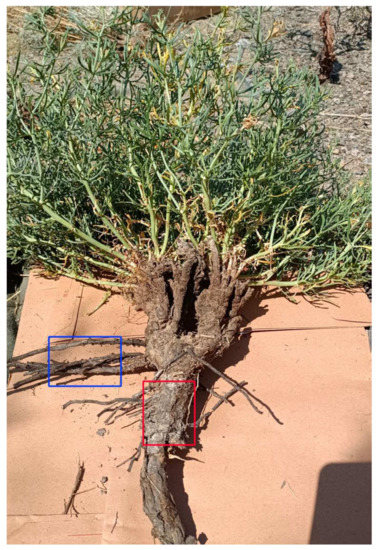 Picture of the study material (Peganum harmala). The red box indicates the intercepted part (taproot), and the blue box indicates the lateral roots.