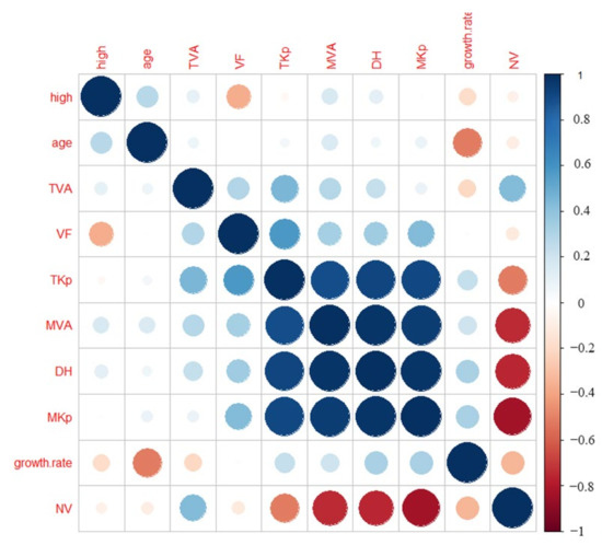 Relationship between the anatomical parameters of the roots of the Zygophyllaceae plants in arid and semi-arid areas of China. High: plant age height (m); Age: (year); Growth.rate: (μm/year); NV: vessel number; VF: vessel fraction (%); TAV: total vessel area (μm²); MVA: mean vessel area (μm²); TKp: total water transfer efficiency (kg m−1 MPa−1 s−1); MKp: mean water transfer efficiency (kg m−1 MPa−1 s−1); DH: hydraulic diameter (μm). Note: Before the correlation analysis, the original data were converted into log10.