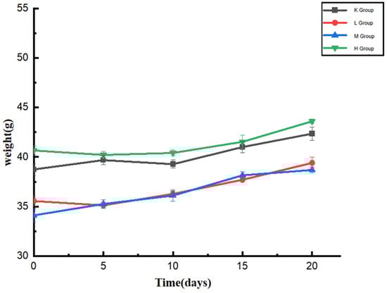 The body weight changes of all Kunming mice in the experiment reflected their physical condition, as shown in Figure 1. After one week of acclimatization, all mice had different body weights due to individual differences between mice. The weights of group K were in the range of 38.7–42.3 g, that of group L was 35.9–39.4 g, that of group M was 34.1–38.6 g, and that of group H was 40.6–43.6 g. There was no significant difference in the body weights of mice between groups (p < 0.05). The weights of mice in each group showed an upward trend during the feeding period. The increase was relatively slow after 15 days, and there was no significant difference compared with the K group (p < 0.05). The results showed that Opuntia ficus-indica anthocyanins did not affect the body weights of normal mice. During the feeding period, the mental state, coat color, gloss, and feces of the mice were compared with those of the normal mice. The mice urinated and defecated normally, indicating that the anthocyanins from the Opuntia ficus-indica did not affect the physiological state of the normal mice.