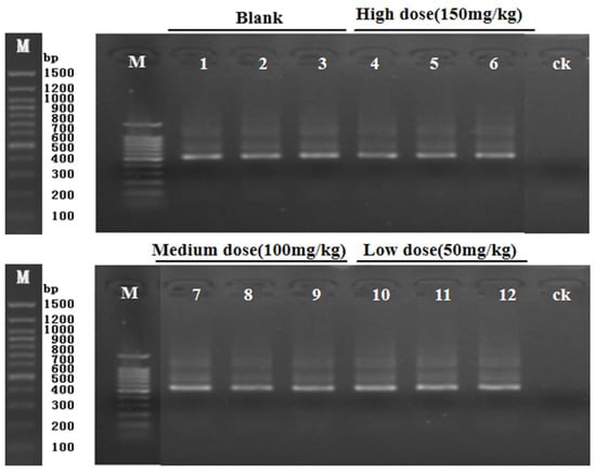 Electrophoresis of cecal contents of mice. PCR products 1, 2, and 3 represent K1, K2, and K3 (blank); 4, 5, 6 represent H1, H2, and H3 (high dose); 7, 8, and 9 represent M1, M2, and M3 (medium dose); 10, 11, and 12 represent L1, L2, and L3 (low dose).