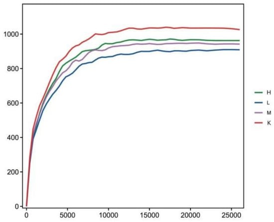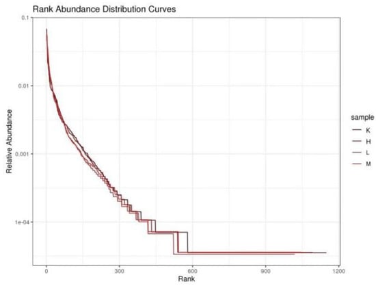 Compared to the K group, the values of Chao1 index and ACE index decreased significantly (p < 0.01) after three weeks of Opuntia ficus-indica anthocyanin feeding, in a dose-dependent manner, indicating a change in the uniformity of gut microbes (Table 2). Compared with the K group, the Shannon index and Simpson index increased significantly (p < 0.05), indicating that the diversity of the flora had been altered (Table 2). The results show that the intestinal bacteria of mice fed Opuntia ficus-indica anthocyanins had greater variation, which was the same effect as observed following the previous in vitro fermentation of Opuntia ficus-indica anthocyanins. The curve of sequencing depth at 20,000 was flattened out (Figure 3), indicating that the sequencing was reliable. It can be seen from Figure 4 that the blank group has the longest curve and a uniform decline, indicating that the abundance of the sample composition is relatively uniform and the species composition diversity is high. Compared with the blank group, the curves for the low, medium, and high dose groups decreased rapidly and steeply, indicating that the distribution of species abundance in the samples was low, the proportion of dominant bacteria was high, and the diversity was reduced. The curves of the middle and high dose groups were similar, indicating that the species similarity was high, and it was further concluded that the low dose group contained the highest dominant flora. The results indicate that feeding anthocyanins to mice could change the species composition richness and increase the growth of dominant flora.