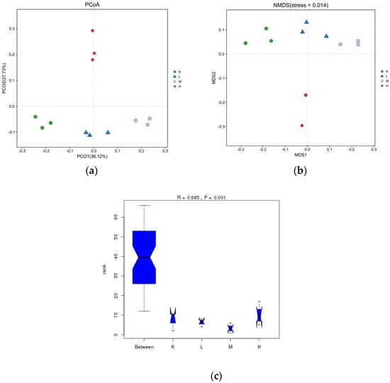 The results from the analysis of differences between the PCoA samples are shown in Figure 5a. The points of color do not overlap or intersect with each other, indicating that the samples are completely separated, which can better describe the characteristics of the mouse intestine. The results indicate that the microbial colonies in the guts of the mice were altered and varied. Among them, the distance between group H and group K is the largest, indicating that the similarity between group H and K is the lowest, i.e., the similarity of the microbial community is the lowest and the difference is large. Furthermore, the distance between group L and group K is the smallest, indicating that group L and K have the greatest similarity. The difference is small. From Figure 5b, NMDS can obtain the stress function value streets = 0.014 ≤ 0.01, which indicates that it has excellent representativeness. From Figure 5c, it can be concluded that R = 0.633 indicates a significant difference between groups, and p = 0.001 < 0.05 is significant. According to the results of the ANOSIM analysis, R = 0.985 indicates a significant difference between groups, and p = 0.001 < 0.01 is extremely significant.