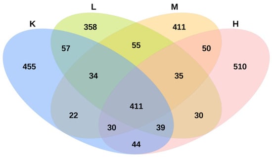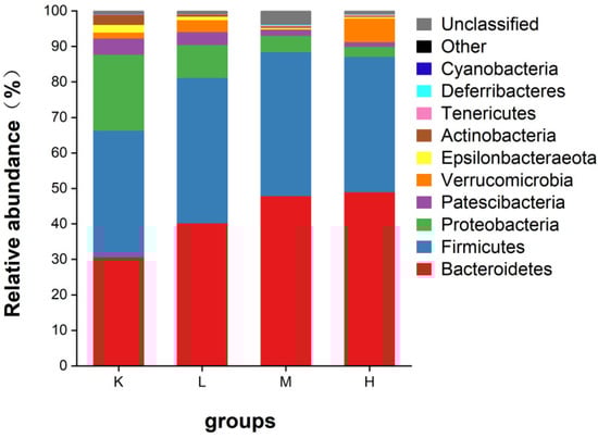 There are four groups, namely group K, group L, group M, and group H. There are 12 samples in total, with three samples in group. The average sequencing depth of these 12 samples is 63752 ± 2235. According to the similarity of 97%, each sample has 905 ± 55 OTUs, indicating that the measurement results can accurately represent the real situation of the intestinal flora in mice. Groups L, M, and H shared 35 OTUs, accounting for 1.4% of the total sequence. There were 411 OTUs in group L, group M, group H, and group K, accounting for 16.2% of the total sequence. The unique OTUs of groups K, L, M, and H were 455, 358, 411, and 510, respectively, accounting for 17.9%, 14.1%, 16.2%, and 20.1% of the total sequences, respectively (Figure 6). The results showed that compared with that in group K, Opuntia ficus-indica anthocyanins altered the composition of the cecal microbiota in mice.