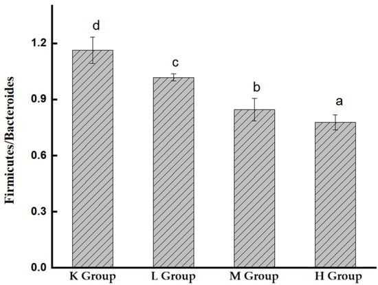 As shown in Figure 7, the intestinal microbes of mice mainly include Firmicutes, Bacteroidetes, Proteobacteria, and Patescibacteria, in addition to a small number of warts. Compared with the K group, Proteobacteria decreased significantly (p < 0.05), Bacteroidetes increased significantly (p < 0.05), and Firmicutes also showed an increasing trend. Compared with the K group, the ratios of Firmicutes/Bacteroidetes decreased to 40.2%, 21.4%, and 14.1%, respectively (Figure 8). These results suggest that Opuntia ficus-indica anthocyanins alter the composition of the gut microbiota in mice.