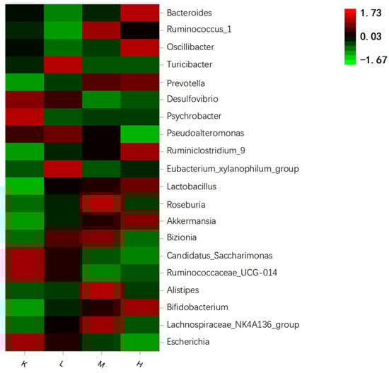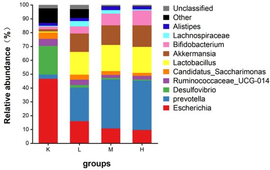 Desulfovibrio, Ruminococcaceae_UCG-014, and Candidatus_Saccharimonas were in group K. After the oral administration of anthocyanins, Prevotella, Akkermansia, Lactobacillus, and Bifidobacterium were the main species (Figure 9). After the oral administration of anthocyanins, compared with the K group, the proportion of Escherichia coli was significantly decreased (p < 0.01), the proportion of Desulfovibrio was significantly decreased (p < 0.05), and the proportion of Prevotella and Lactobacillus significantly increased. (p < 0.05). Bifidobacteria also showed an upward trend (Figure 10). In addition, compared with the K group, Akkermansia was unique in the L, M, and H groups. These results suggest that gavage with Opuntia ficus-indica anthocyanins is beneficial for the growth of intestinal probiotic-producing bacteria in mice.