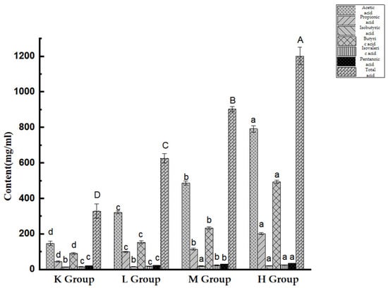 Content of short-chain fatty acids within mouse cecal contents. Different lowercase letters indicate significant differences between groups (p < 0.05), and different capital letters indicate extremely significant differences between groups (p < 0.01).