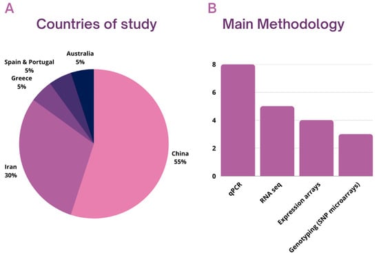 Countries from which the studies originated (A), and main methodology used for the investigation of lncRNAs on male infertility (Β).