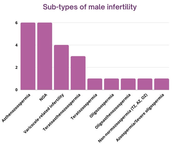 Studies included in the systematic review categorized by sub-type of male infertility; NOA: non-obstructive azoospermia; TZ: teratozoospermia; AZ: asthenozoospermia; OZ: oligozoospermia.