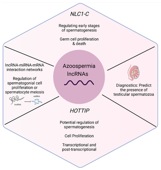 Although many genes have been associated with specific subtypes of male infertility [], a large number of cases are characterized as idiopathic, and no cause can be identified []. Furthermore, genomes are extensively transcribed (>85%), but only a small percentage of these transcribed RNAs are translated into proteins []. For many years, these intergenic regions were considered “junk DNA,” but recently, it was discovered that all of these noncoding RNAs (ncRNAs) can have a functional role []. More specifically, ncRNAs can be classified into several categories, such as microRNAs (miRNAs), circular RNAs (circRNAs), long noncoding RNAs (lncRNAs), PIWI-interacting RNAs (piRNAs), etc. LncRNAs are transcripts longer than 200 nucleotides that are located in the cytoplasm or the nucleus and affect gene expression through transcriptional, post-transcriptional, and epigenetic regulation [,]. Furthermore, they exert their regulatory role through interactions with proteins and transcriptional factors, mRNAs, and miRNAs, and it has been observed that they have tissue-specific and condition-specific expression patterns [].