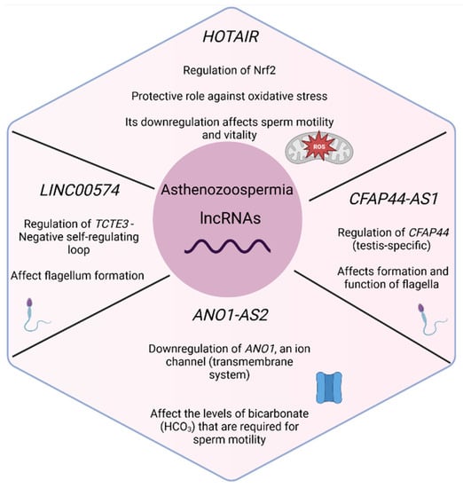 Individual lncRNAs with a role in spermatogenesis and asthenozoospermia according to the studies included in the present systematic review. Figure made in Biorender.com.