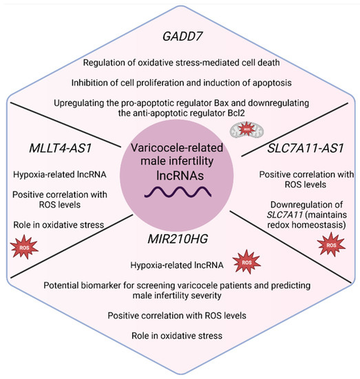 As in other sub-types of male infertility, studies regarding varicocele-related infertility focus on particular lncRNAs (Table 4). LncRNA growth arrested DNA damage-inducible gene 7 (GADD7) is considered a well-studied lncRNA, as experiments prove that its complex interactions with Cdk6, among others, regulate oxidative stress-mediated cell death []. Oxidative stress has been associated with varicocele; thus, Zhao et al. (2017) [] explored the role of GADD7 on varicocele-related infertility. GADD7 was found to be upregulated in patients with varicocele, and its expression was negatively correlated with sperm count, an important semen parameter. Further experiments in cell lines also confirmed its contribution to male infertility by inhibiting cell proliferation and promoting cell apoptosis. The authors suggest that GADD7 may exert its effect by upregulating the pro-apoptotic regulator Bax and downregulating the anti-apoptotic regulator Bcl2.