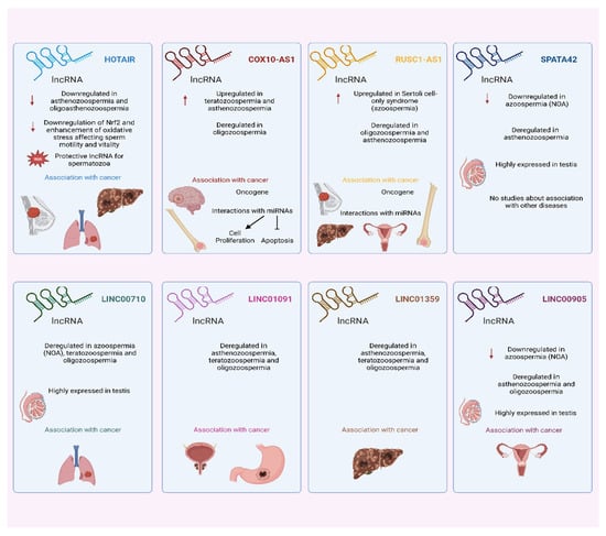 Individual lncRNAs with a role in spermatogenesis and azoospermia according to the studies included in the present systematic review. Figure made in Biorender.com (accessed on 17 September 2022).