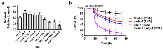 To identify a regulator of SKN-1 in the p38 MAPK pathway in C. elegans, we screened novel MAPKKKs that regulate SKN-1 under oxidative stress conditions by comparing the survival rates of SKN-1 transgenic worms treated with RNAi against the candidate genes. Since NSY-1 is a partial regulator of SKN-1 in the oxidative stress pathway [20], we screened by simultaneous inhibition of nsy-1 and MAPKKKs, including dlk-1 (the ortholog of mammalian MAP3K12), tap-1 (the ortholog of mammalian TAB1), mom-4 (the ortholog of mammalian MAP3K7), zak-1 (the ortholog of mammalian MAP3K20), irk-1 (the ortholog of mammalian KCNJ14, KCNJ16, and KCNJ18), mtk-1 (the ortholog of mammalian MAP3K4), kin-18 (the ortholog of mammalian TAOK1, TAOK2, and TAOK3), and mekk-3 (the ortholog of mammalian MAP3K3) using specific RNAi (Figure 1a). The knockdown efficiency of each RNAi was confirmed by qRT-PCR (Figure S1). SKN-1 transgenic worms displayed an extraordinarily high survival rate even when exposed to 5–10 mM t-BOOH, an exogenous inducer of ROS, in the conventional oxidative stress assay (Figure S2); therefore, an extraordinarily high concentration of 20 mM t-BOOH was used for the screening. We found that concomitant inhibition of mekk-3 and nsy-1 showed the most significant decrease in the RNAi screening (Figure 1a) and completely suppressed resistance against oxidative stress compared to a single knockdown (Figure 1b). These results showed that mekk-3 RNAi suppressed the oxidative stress resistance achieved through the overexpression of SKN-1, and mekk-3 partially complements the function of nsy-1.
