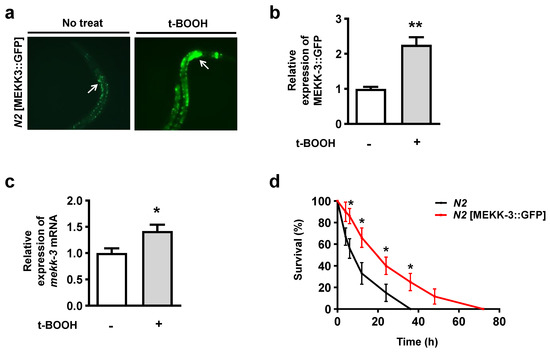 To determine the expression pattern of MEKK-3, we analyzed the expression of a transgene in which GFP was fused to the C-terminus of full-length MEKK-3 (MEKK-3::GFP). Expression of MEKK-3::GFP was observed in the intestine of wild-type (N2) young adult worms (Figure 2a). Notably, after treatment with 7.5 mM t-BOOH at 20 °C for 16 h, the intestinal cells showed high levels of MEKK-3::GFP (Figure 2a,b), and the mRNA expression of MEKK-3 was significantly increased (Figure 2c). In addition, we tested whether MEKK-3 overexpression increased resistance against oxidative stress. Surprisingly, MEKK-3:: GFP transgenic worms showed approximately three times higher resistance to oxidative stress than N2 (Figure 2d and Figure S3); however, their longevity was not significantly higher than that of N2 (Figure S3, Table S2). Collectively, these results suggest that MEKK-3 overexpression has a strong positive effect on resistance against oxidative stress; however, it is not sufficient to extend the lifespan.