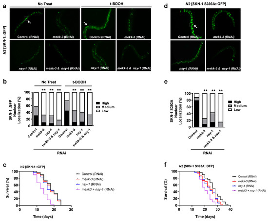Next, we investigated the effects of MEKK-3 and NSY-1 on SKN-1 localization using a phosphorylation-inhibiting mutant in which serine residues at 393 of SKN-1::GFP were replaced with alanine (SKN-1 S393A::GFP). In a previous study, the SKN-1 S393A::GFP mutant was constitutively localized to the intestinal nuclei by alteration of the critical inhibitory glycogen synthase kinase-3 (GSK-3) phosphorylation site; it increased oxidative stress resistance compared to N2 SKN-1::GFP [24]. We found that the nuclear localization of SKN-1 S393A::GFP was strong in the intestinal nuclei but was significantly decreased by genetic knockdown of mekk-3 and nsy-1 via RNAi (Figure 3d,e). These results also exclude the possibility that sek-1 and p38 signaling is simply epistatic to gsk-3 with respect to SKN-1 regulation. Interestingly, the individual and synergistic effects of mekk-3 and nsy-1 knockdown were more pronounced on the lifespan of SKN-1 S393A transgenic worms than on SKN-1 transgenic worms (Figure 3f, Table S2). This is possibly because SKN-1-dependent lifespan extension in the absence of GSK-3 inhibitory phosphorylation enhances the effect of mekk-3 and nsy-1 knockdown on longevity. Collectively, these results demonstrated that MEKK-3 is required for the nuclear translocation of SKN-1 and that it plays a synergistic role with NSY-1.