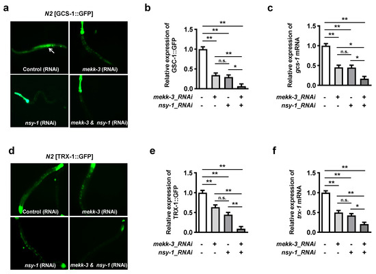 SKN-1 promotes the expression of phase II detoxification genes, which encode enzymes responsible for antioxidants and glutathione synthesis [13,16]. The significant role of MEKK-3 was determined via examination of SKN-1 target genes, such as gcs-1 and trx-1, which encode the gamma-glutamine cysteine synthase heavy chain and thioredoxin, respectively, and was induced by oxidative stress (Figure S5). To investigate whether MEKK-3 regulates SKN-1 target genes, we used transgenic worms overexpressing gcs-1 with C-terminal GFP (GCS-1::GFP) or trx-1 with C-terminal GFP (TRX-1::GFP). Under oxidative stress conditions, mekk-3 and nsy-1 knockdown significantly decreased the expression of GCS-1::GFP (Figure 4a,b) and mRNA expression of gcs-1 (Figure 4c). Similarly, the expression of TRX-1::GFP (Figure 4d,e) and mRNA expression of trx-1 (Figure 4f) were significantly decreased following mekk-3 and nsy-1 knockdown. These results indicate that MEKK-3 is a key factor in the fine regulation and optimal activation of detoxification genes induced by SKN-1.