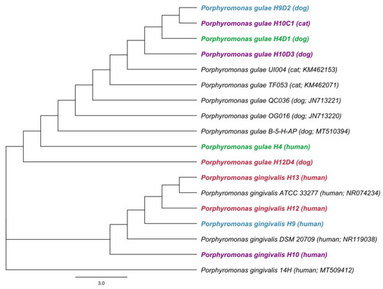 Sequence analysis of the 16S rRNA fragment using both primer pairs for P. gulae and P. gingivalis showed identical sequences of P. gulae in patient H4 and his dog (H4D1). On the other hand, in patient H9 and his dog (H9D2), identical sequences of P. gulae were confirmed only using species-specific primers for P. gulae. Based on the detection of P. gulae in owners and their dogs, there is the possibility of transmission resulting from identical sequences of human and animal strains. Sequences were compared to known P. gulae and P. gingivalis gene sequences from the sequence database of the National Center of Biotechnology Information (NCBI, Bethesda, MD, USA). A phylogenetic tree for sequences obtained using primers for P. gingivalis is shown in Figure 1.