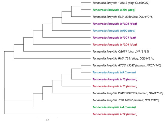 A phylogenetic analysis showed differences between the sequences of the 16S rRNA gene for T. forsythia in humans and animals (Figure 2). Based on this, the transmission of T. forsythia from companion animals to their owners has not been proven.