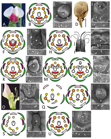 - Wang, Z.; Luo, Y.; Li, X.; Wang, L.; Xu, S.; Yang, J.; Weng, L.; Sato, S.; Tabata, S.; Ambrose, M.; et al. Genetic control of floral zygomorphy in pea (Pisum sativum L.). Proc. Natl. Acad. Sci. USA 2008, 105, 10414–10419. [Google Scholar] [CrossRef]