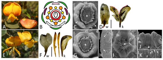 General view (A,E), diagram (B), petal morphology (ethanol-fixed material: D,F), and details of FN morphology (C,G–K) of flowers of different accessions of Cajanus cajan. (A–C), wild-type flower; (E–H), llt mutant; (D,I–K), pct mutant. (H) is an enlarged portion of (G); (K) is an enlarged portion of (J), while (J) is the same FN as on (I) but seen from inside after removal of carpel base. (C,G,I) are oriented with their abaxial side downwards. Key: red line (D) = petal damage caused by the dissection; arrowheads = exemplary nectariferous stomata; asterisk = carpel base or place where it was attached; fn = floral nectary; k = keel petal [diversity within a single accession is visible on (E,F)]; vs = vexillary stamen; w = wing. For color designations on floral diagram, see Figure 1. Scale bars: 0.5 cm (D,F), 300 μm (C,G,I,J), 30 μm (H,K).